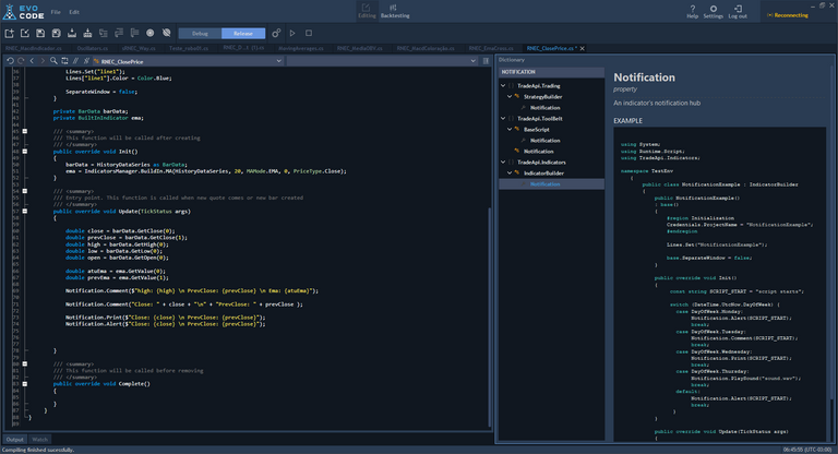 A plataforma disponibiliza UMa API CHAMADA EvoCode baseada em C# para desenvolvimento de indicadores e estratégias